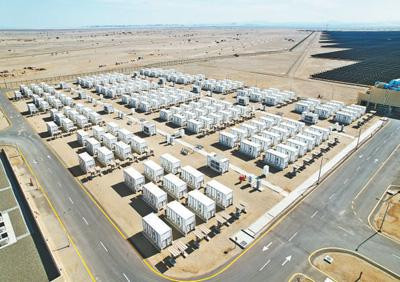 记者在多个电站看到,在光伏阵列旁,整齐排列着一座座白色的集装箱柜。每个集装箱柜就是一组巨大的储能电池。据介绍,项目共有6个储能电站,由607个储能集装箱组成,设计总储电容量为1.3吉瓦。这也是全球规模最大的离网储能项目。